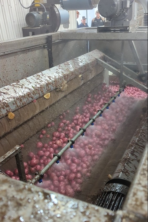 The screen sizer offers a economical means to size roundish potatoes or onions. A wire mesh belt or rubber web screen is driven in a circular fashion. Smaller produce falls through the holes and onto the cross conveyor. Depending on the size of the machine a number of driven shaker rollers provide lift and agitation to the screen/belt for re-sizing for increased accuracy. The idler rollers can be easily adjusted to loosen screen tension for easier screen changing.